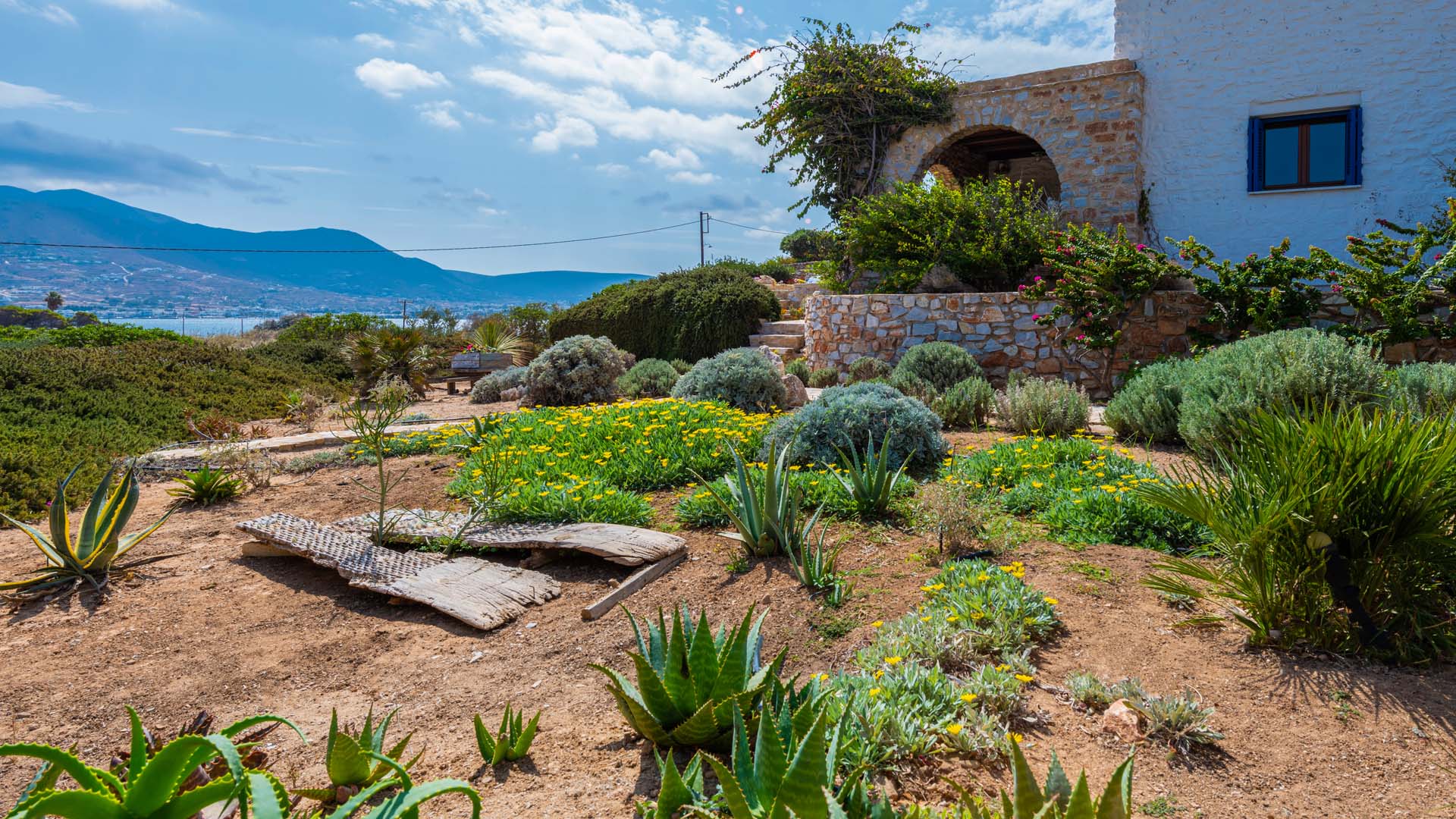 In the garden there is a big variety of aloe, mediterranean herbs and flowers. Color and scent in a dazzling combination.