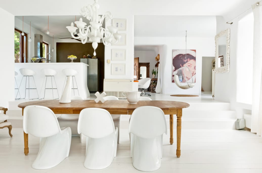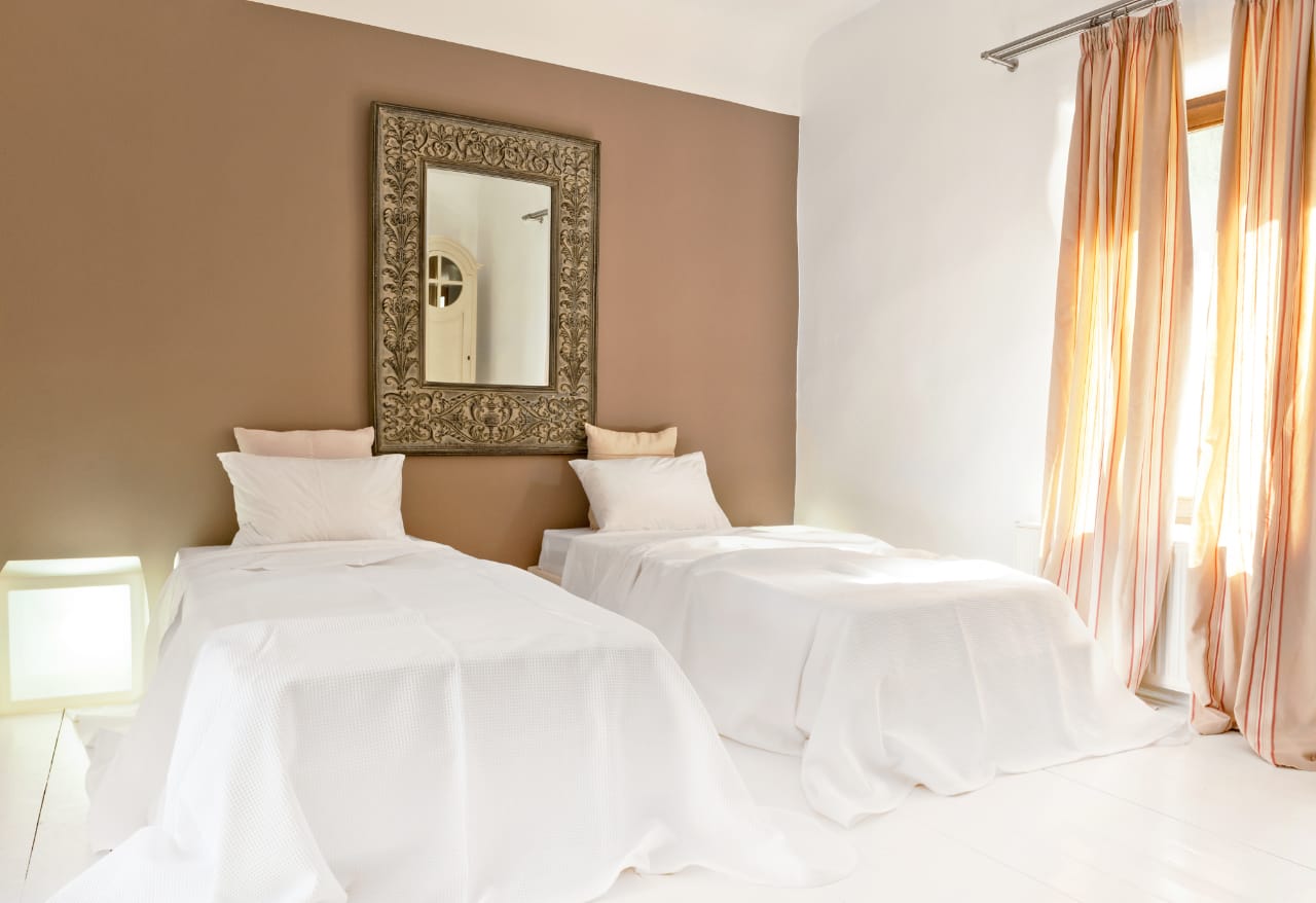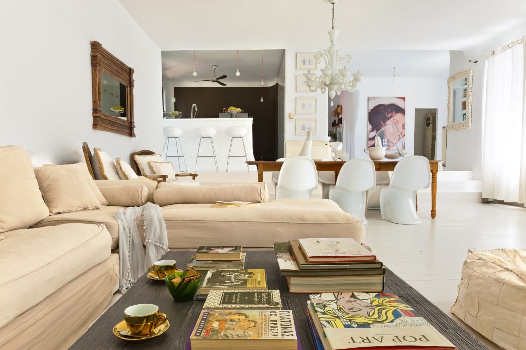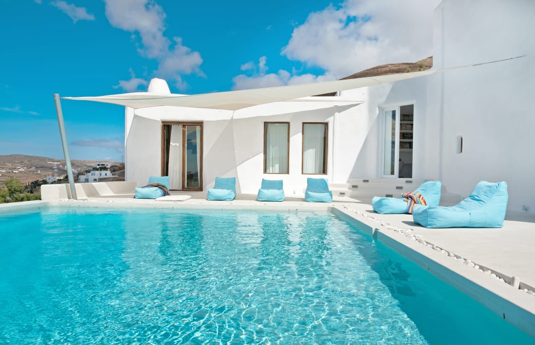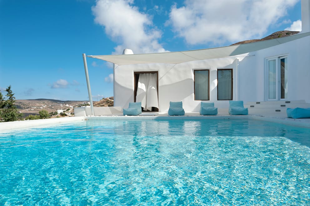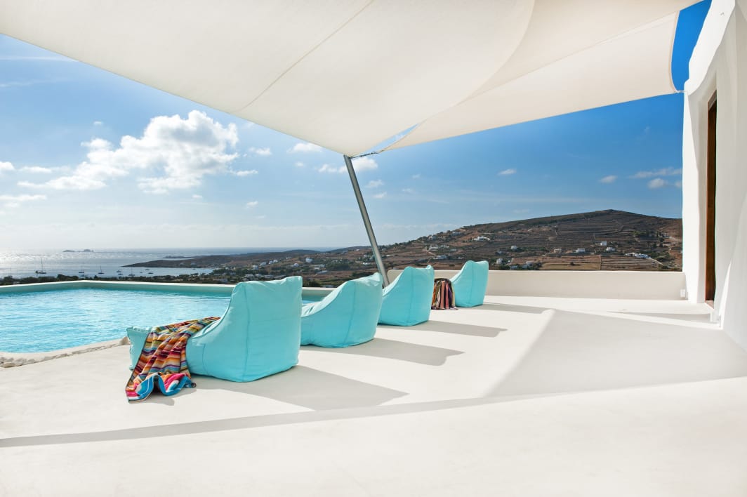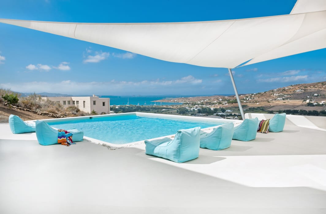 Villa White, is built on a private 8000m2 plot only 2 km from Parikia’s port and town centre. On a hill full of trees with breathtaking sunset view overlooking the town and the port and unique decoration, the villa is the perfect choice for those seeking for privacy and luxury. The villas design is inspired Cycladic architecture in a modern contemporary way. The Aegean light fills all the villa amplified by the white and neutral colors prevailing in all indoor and outdoor spaces. Decorated with the blue and green of nature and exceptional, modern design items the villa gives a feeling of an art gallery and even the smallest detail is a pleasant surprise to the guest, showing the love of its owner.