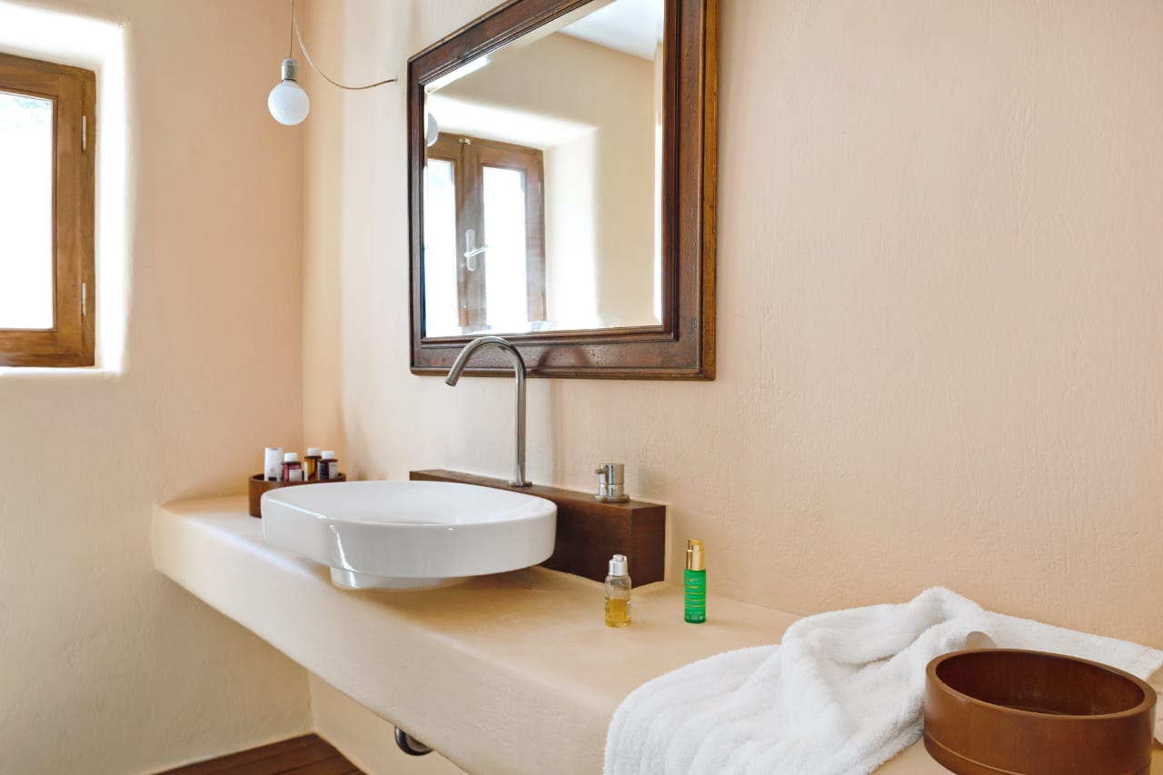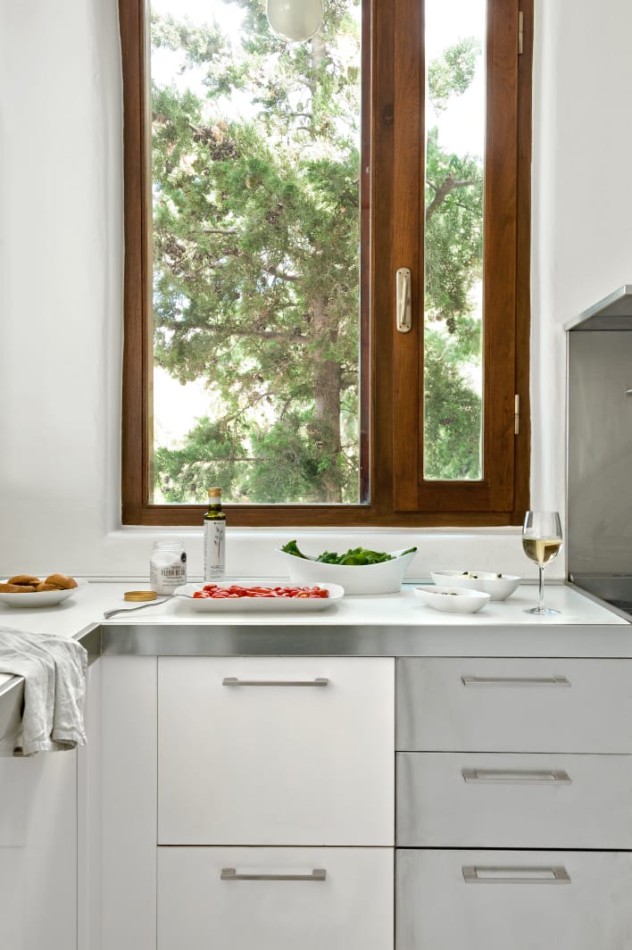 The pool area surrounded by the villa is a natural extension of the building. With comfy double sunbeds and a big wooden dining table that can easily seat 8 people is the perfect spot to relax, sunbathe and enjoy nature and the breathtaking view of the port and the close islands around. The main entrance is in the ground floor. Entering the villa you can see the pool and admire the view. On your right there is a big open plan kitchen that communicates with the spacious dining and living room. On your left there is a bedroom with two single beds and a spacious sunny bedroom with a double bed, facing the pool. The two rooms share the bathroom in between which can also be used as a guest bathroom. On the upper level the master bedroom with a queen size double bed, en suited bathroom with Jacuzzi bathtub, a fireplace and walk-in closet .